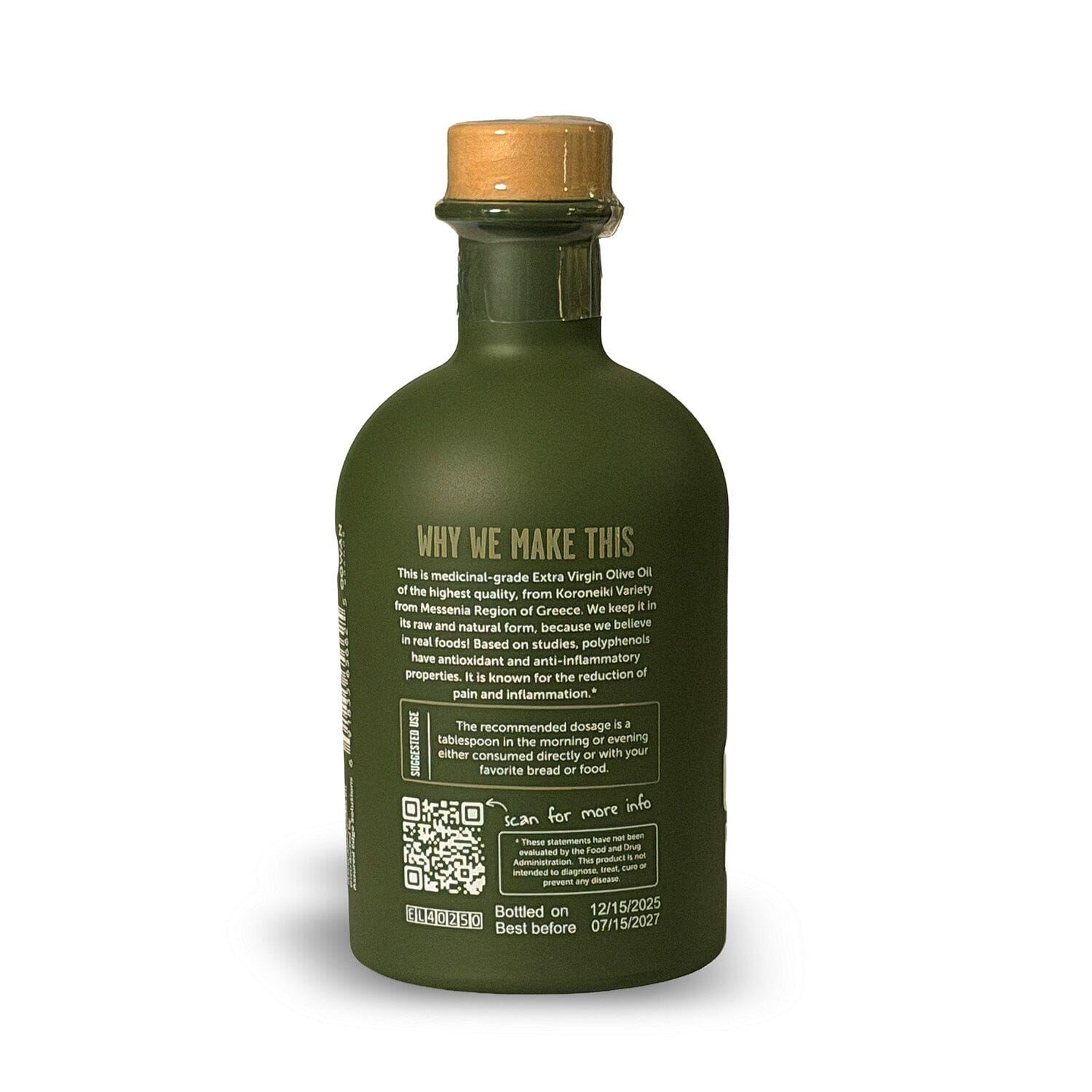 Our cold-pressed 1200+ Polyphenol Organic Extra Virgin Olive Oil from Greece is the highest polyphenolic content available, intended for therapeutic use. It has a strong flavor profile and should be diluted and taken in precise amounts.